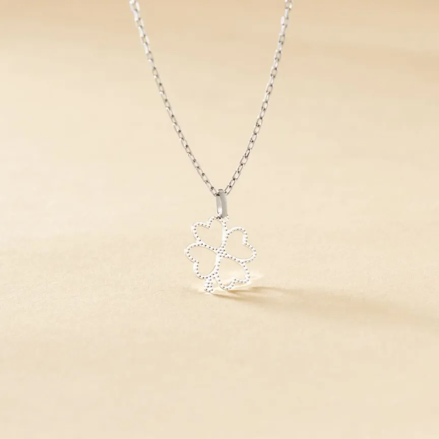 Pendentif Or Blanc 375/1000 Forme Trefle Effet Diamante