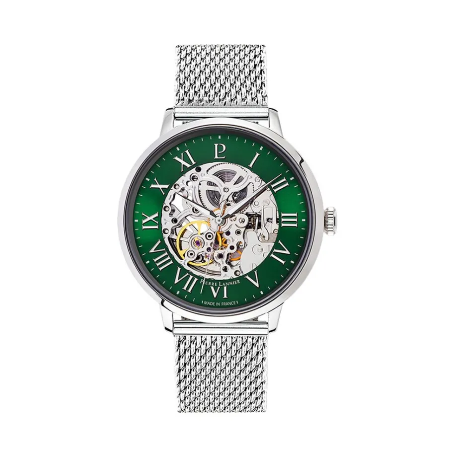 Montre Pierre Lannier Automatiqueacier Argente Ronde Automatique 42mm Fond Vert Bracelet Acier Inoxydable Argente Milanais 323d171