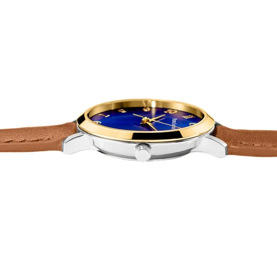 Montre Pierre Lannier Chouquette Acier Bicolore Rond Quartz 30mm Fond Bleu Bracelet Cuir Marron 046h764