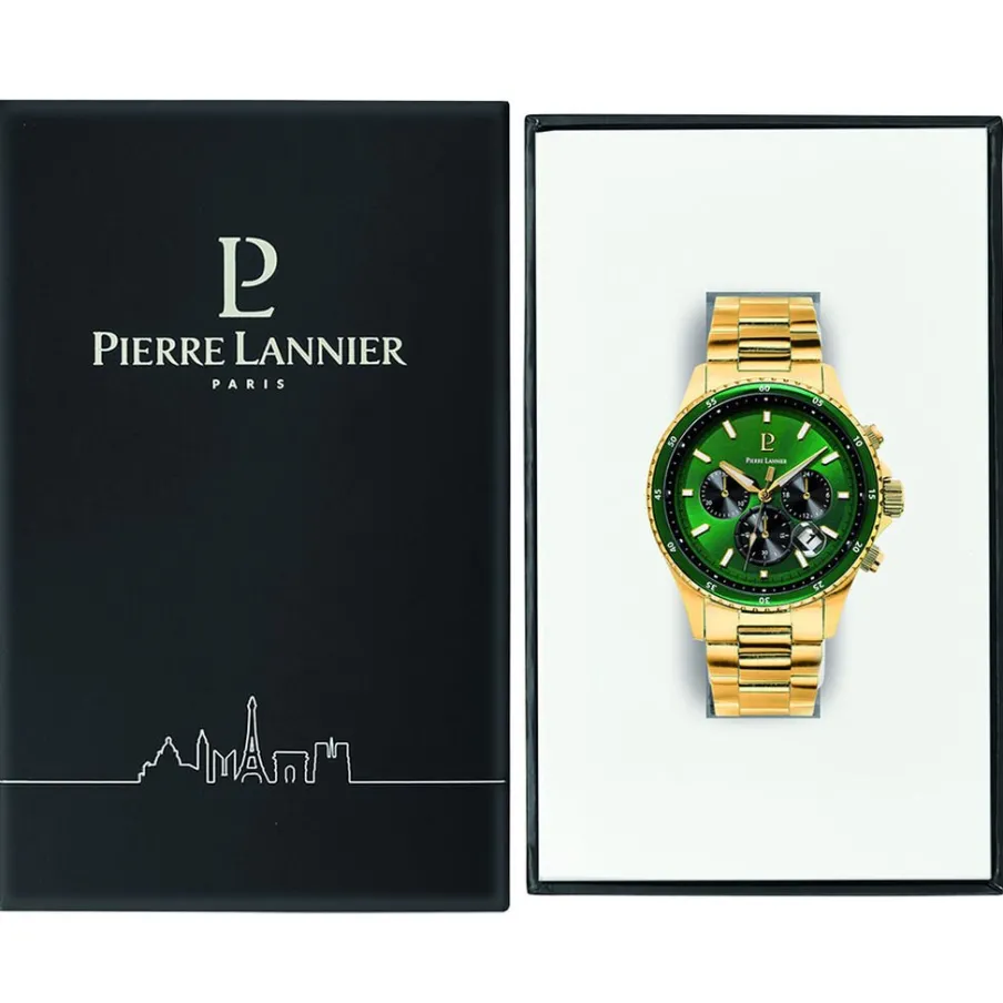 Montre Pierre Lannier Cronos Acier Doré Rond Quartz 43.5mm Chronographe Fond Vert Bracelet Acier Doré 228j062