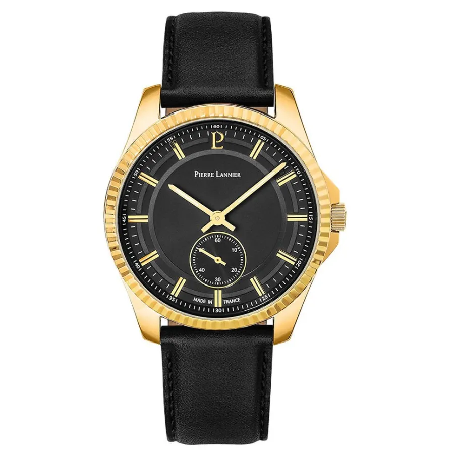 Montre Pierre Lannier Metropolitain Acier Dore Ronde Quartz 40mm Fond Noir Lunette Dentelee Bracelet Cuir De Veau Marron 247h033