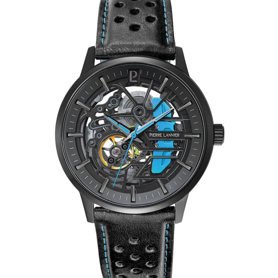 Montre Pierre Lannier Paddock Acier Noir Ronde Automatique 43mm Fond Noir Et Bleu Bracelet Cuir De Vache Noir 345a466