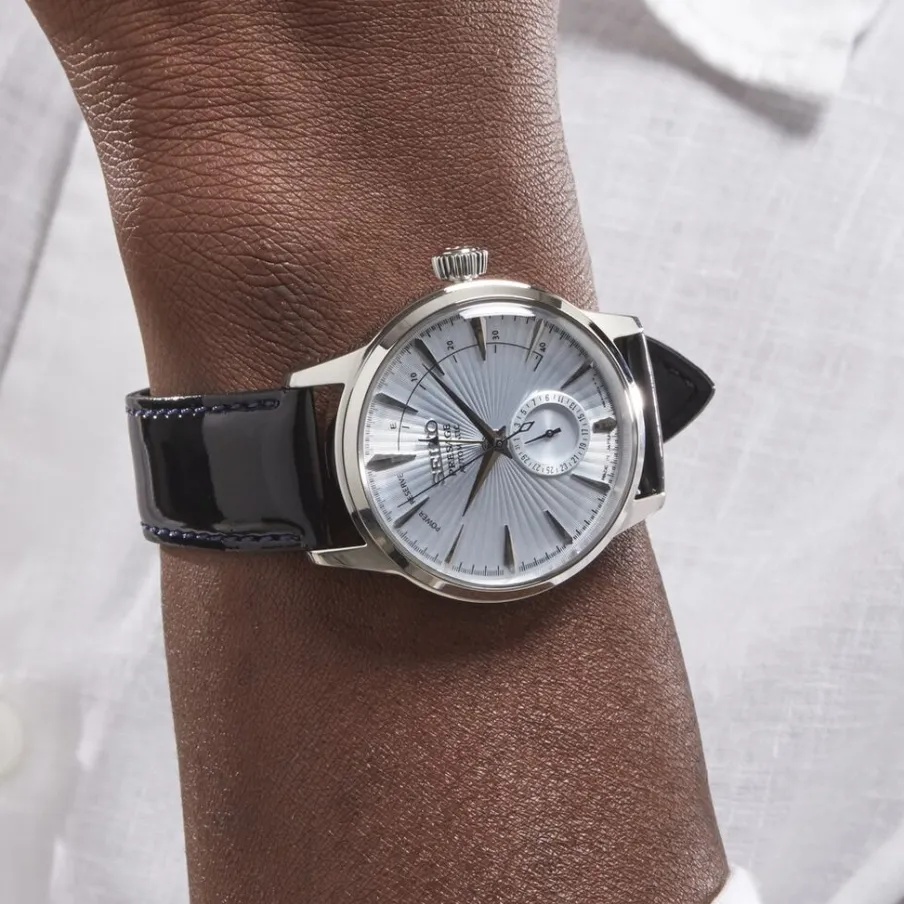 Montre Seiko Presage Acier Blanc Ronde Automatique 40mm Fond Bleu Bracelet Cuir Noir Ssa343j1