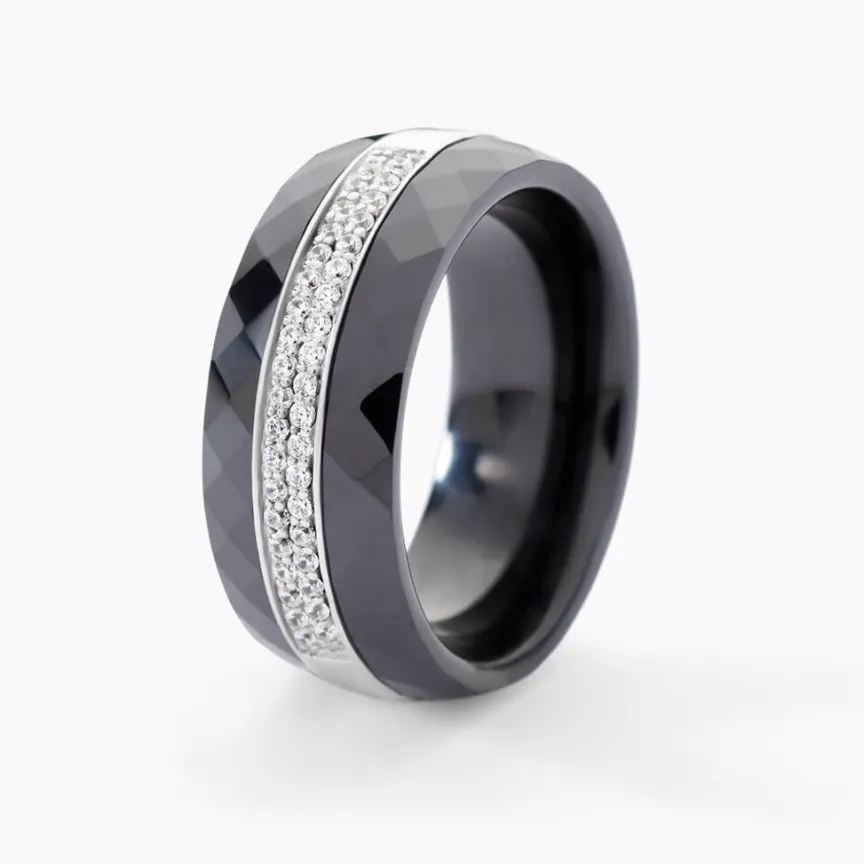 Bague Argent Blanc 925/1000 Ceramique Noire Facettee 2 Rangs Oxydes De Zirconium Blancs