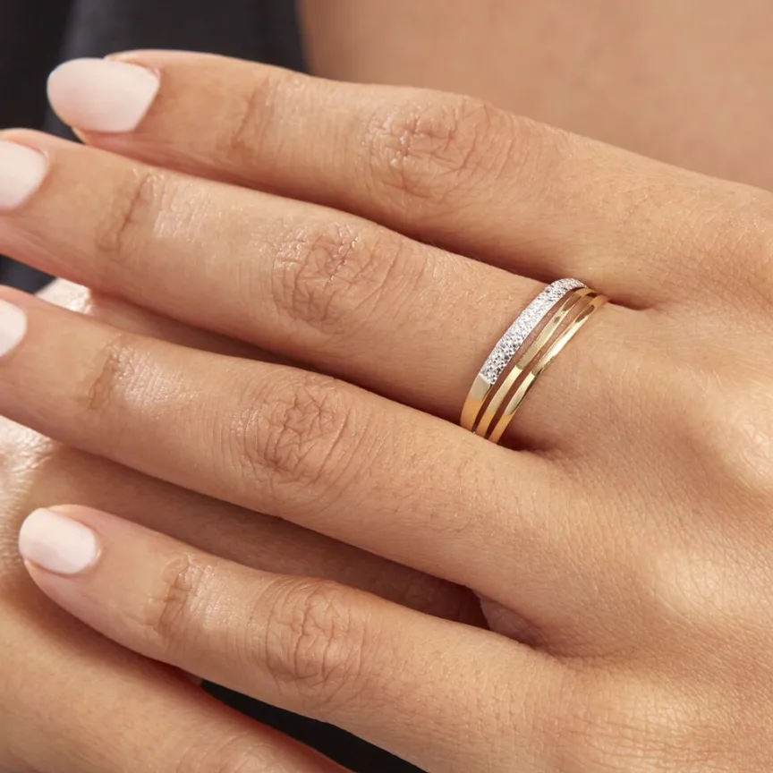 Bague Or Jaune 375/1000 Forme Vagues Un Rang Pave Diamants
