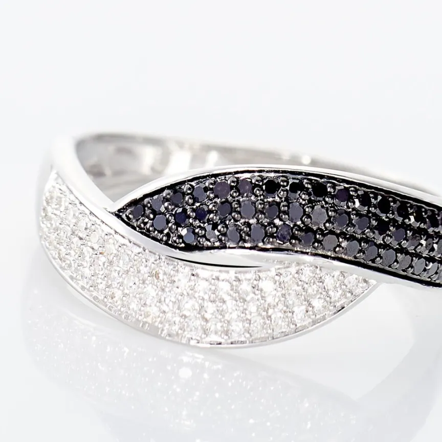 Bague Or Blanc 375/1000 Forme Croisée Diamants Noirs Et Diamants Blancs