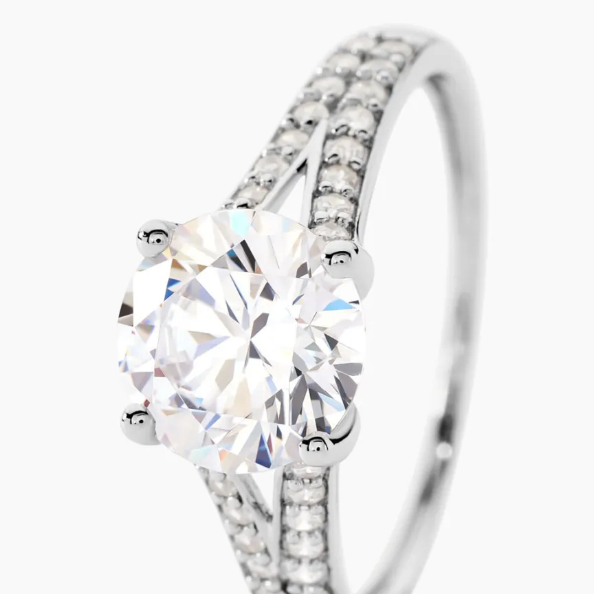 Solitaire Or Blanc 375/1000 Oxyde Central Et Corps De Bague Double Accompagne Oxydes