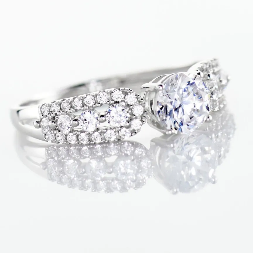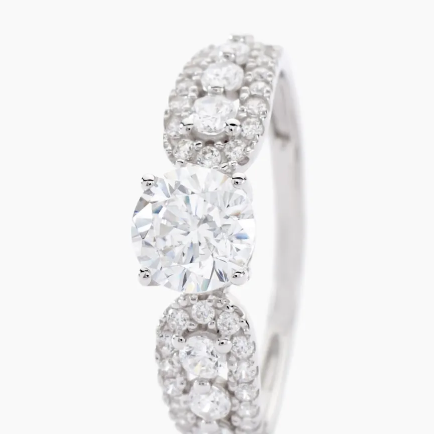 Bague Or Blanc 375/1000 Solitaire Oxyde De Zirconium Central 5.2mm Accompagne Oxydes De Zirconium