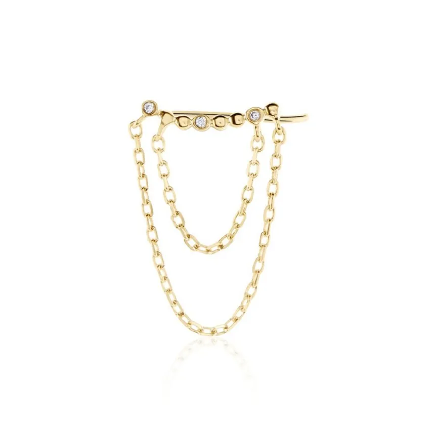 Bijou D’oreille Unitaire Plaqué Or Jaune Barrette Oxydes De Zirconium Double Chaînes Forçat