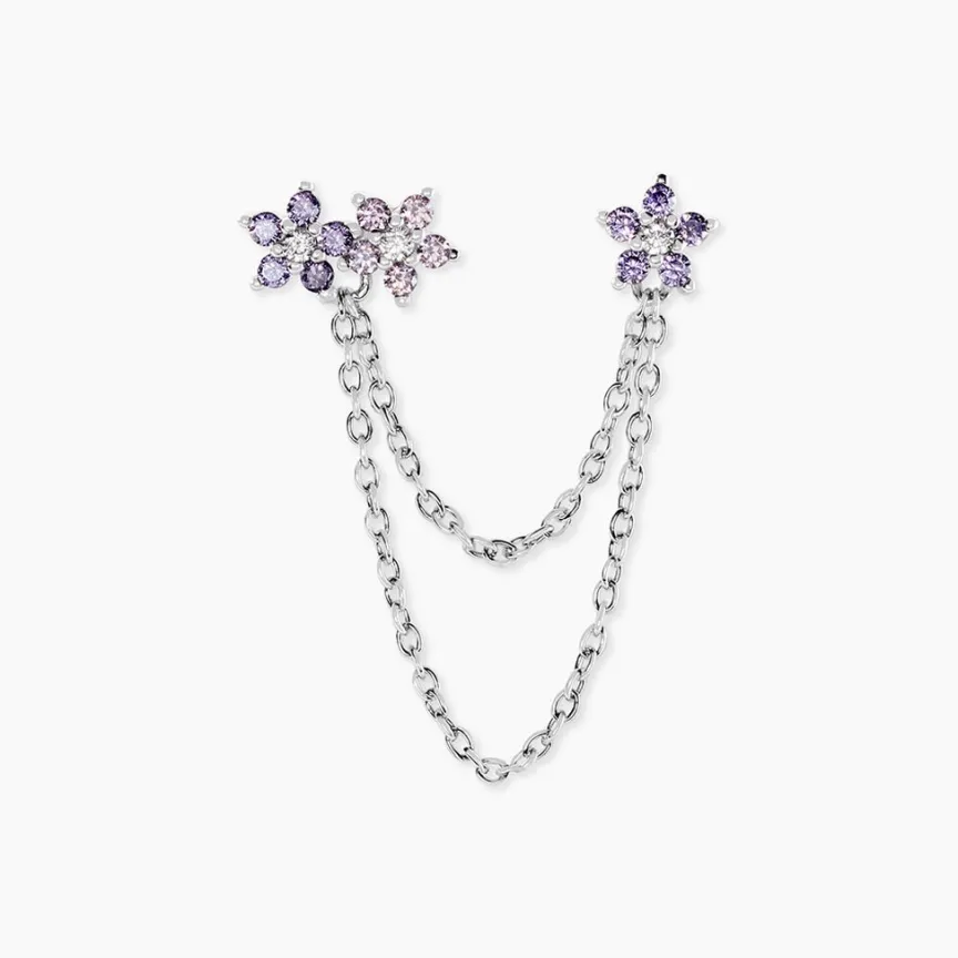 Boucle D’oreille Unitaire Pendante Argent Blanc 925/1000 Fleurs Oxydes Violets Et Roses Chaines Forcat 26cm