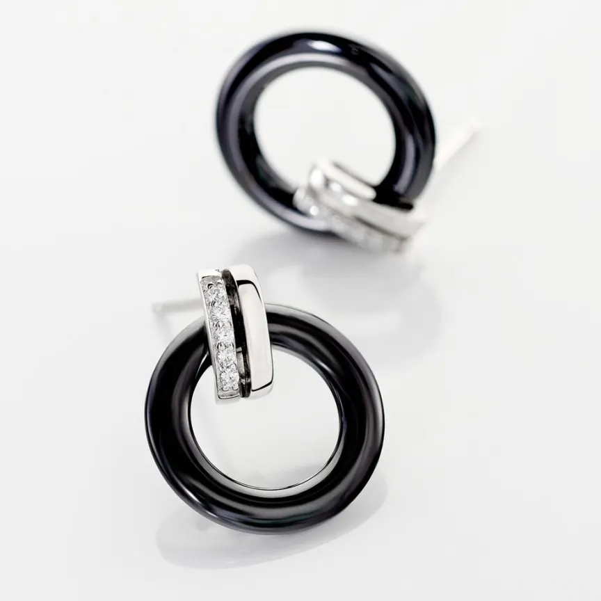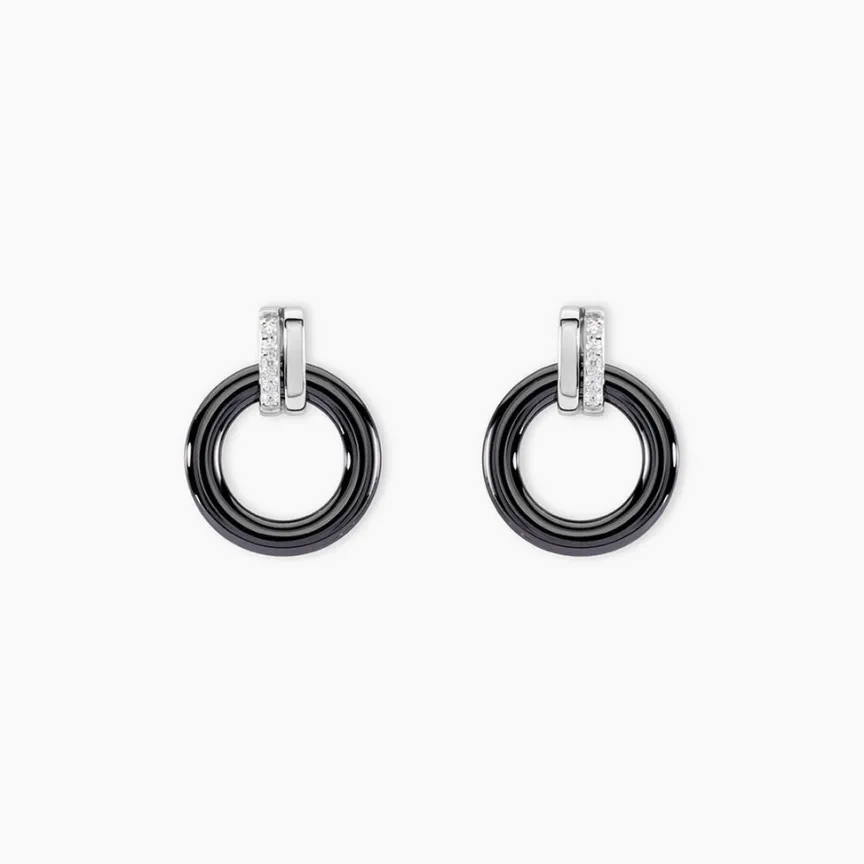 Boucles D’oreilles Argent Blanc 925/1000 Cercles Ceramique Noire Et Liens Demi Paves Oxydes De Zirconium