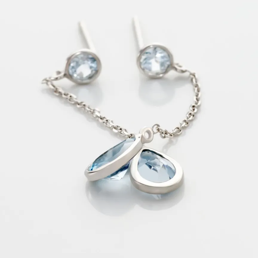 Boucles D’oreilles Or Blanc 375/1000 Pendantes Topazes Bleues Sur Chaine Maille Forçat