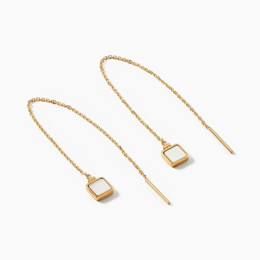 Boucles D’oreilles Or Jaune 375/1000 Double Pendantes Formes Carres Nacres Blanches Serti Clos Chaine Maille Jaseron