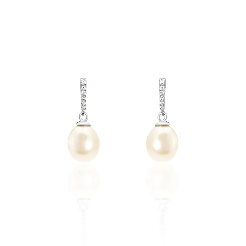 Boucles D’oreilles Pendantes Argent Blanc 925/1000 Perles De Culture Blanches 8/8.5mm Oxydes De Zirconium