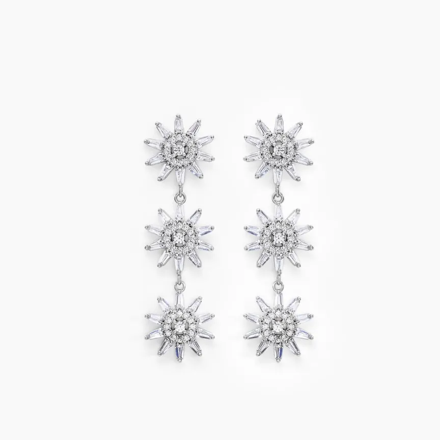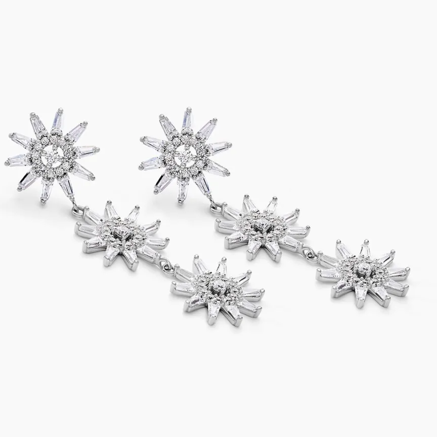 Boucles D’oreilles Dépareillées Argent Blanc 925/1000 Fleurs Pavage Oxydes De Zirconium