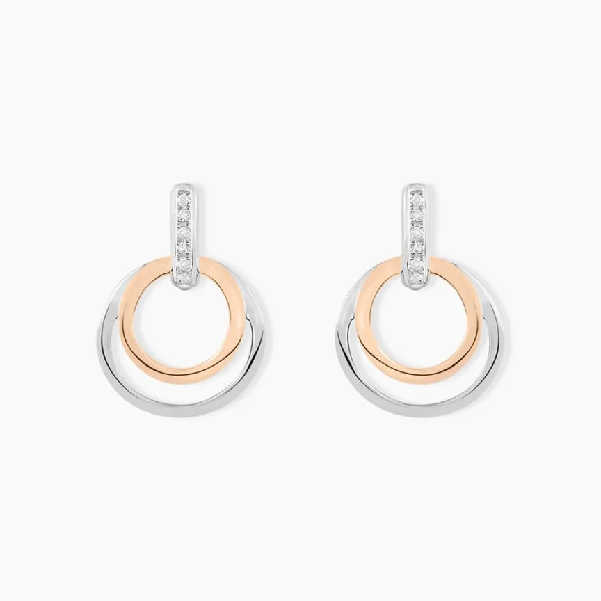 Boucles D’oreilles Or Bicolore 375/1000 Pendantes Doubles Cercles Ajoures Et Barrettes Pavage Diamants
