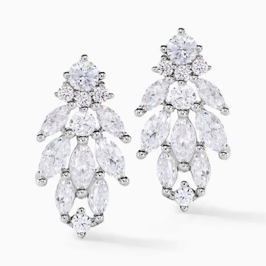 Boucles D’oreilles Puces Or Blanc 375/1000 Multipierres Gouttes Et Navettes Oxydes De Zirconium Serti Griffes