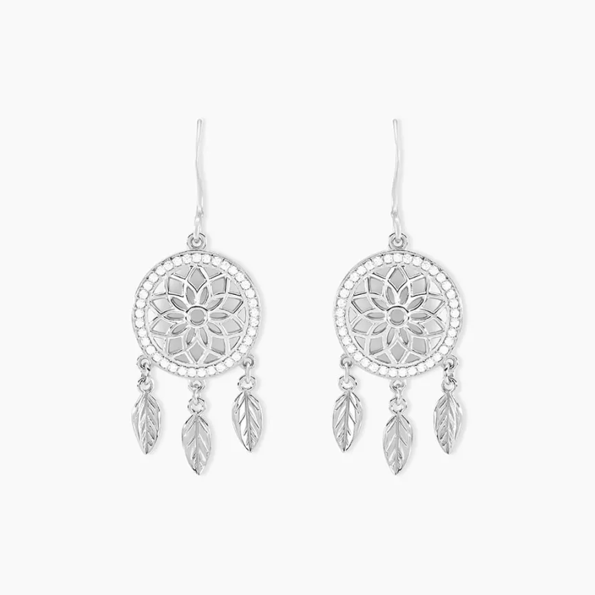 Boucles D’oreilles Pendantes Argent Blanc 925/1000 Attrape Rêve Oxydes De Zirconium