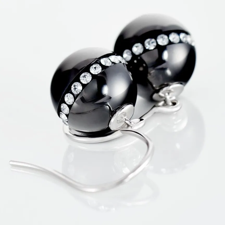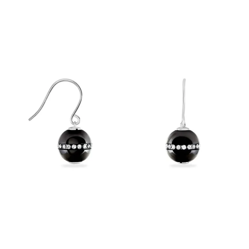 Boucles D’oreilles Pendantes Argent Blanc 925/1000 Boules Ceramique Noires Rang Pierres Blanches