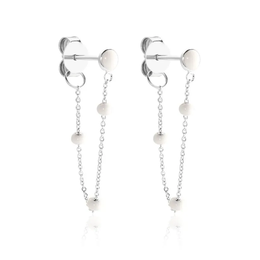 Boucles D’oreilles Pendantes Argent Blanc 925/1000 Email Blanc Maille Forçat 4.3cm