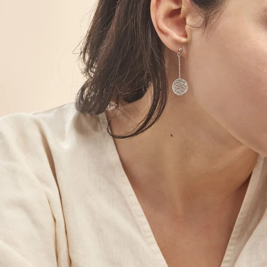 Boucles D’oreilles Pendantes Argent Blanc 925/1000 Rosaces Effet Perle Mailles Boules