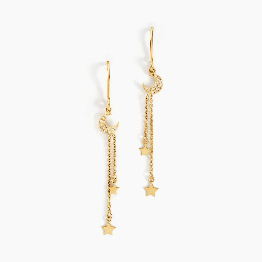 Boucles D’oreilles Pendantes Or Jaune 375/1000 Pampilles Lunes Et Etoiles Oxyde De Zirconium Blanc Serti Pavage