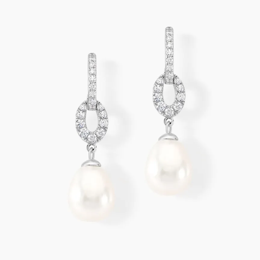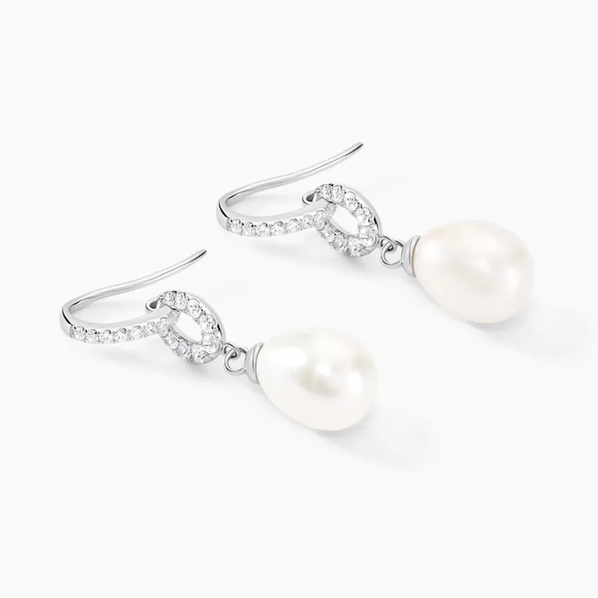 Boucles D’oreilles Argent Blanc 925/1000 Oxydes De Zirconium Anneau Ovale Perle De Culture 8.5/9mm