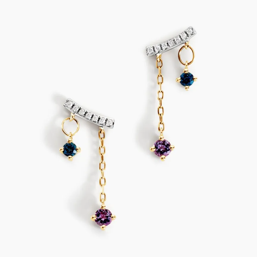 Boucles D’oreilles Pendantes Or Jaune 375/1000 Amethystes Chaine Topaze Bleu London Serti Griffes Sur Barre Oxydes