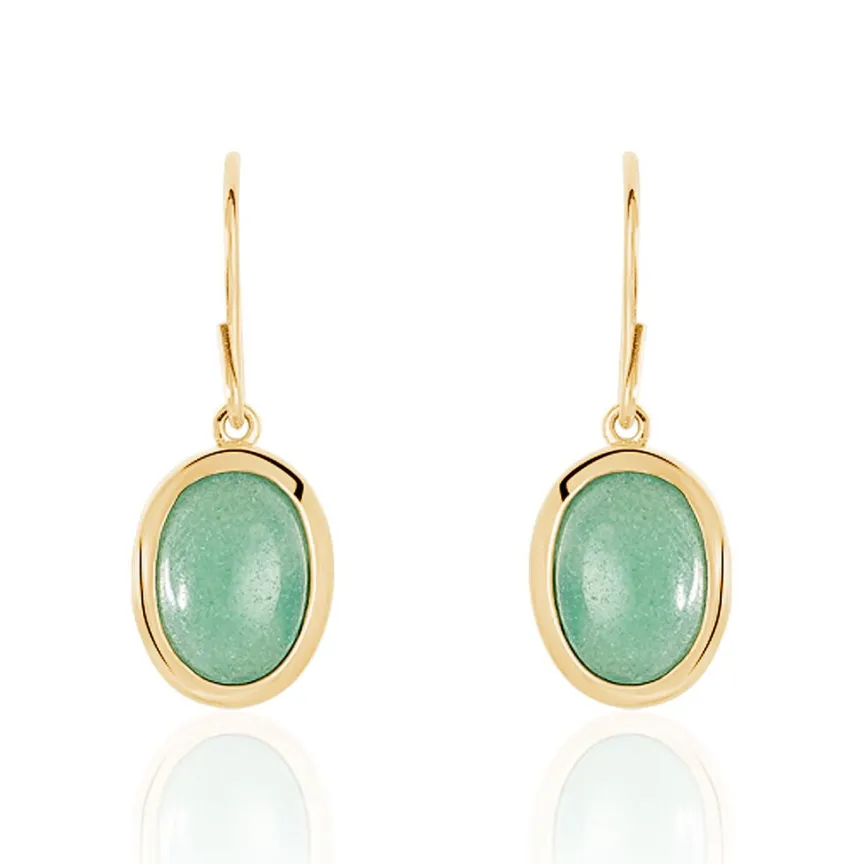 Boucles D’oreilles Pendantes Plaqué Or Jaune Avec Aventurines Ovales Vertes Serti Clos