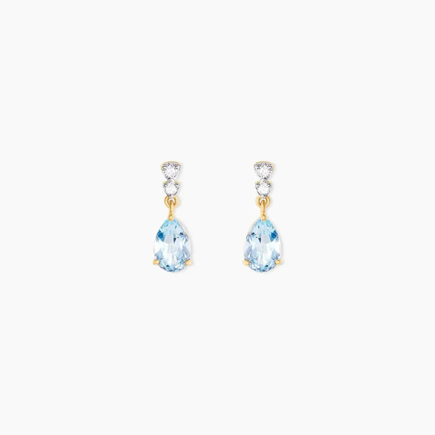 Boucles D’Oreilles Pendantes Or Jaune 375/1000 Goutte Topaze Bleu Sky Poire 1Ct Accompagne Oxyde De Zirconium Serti Griffes