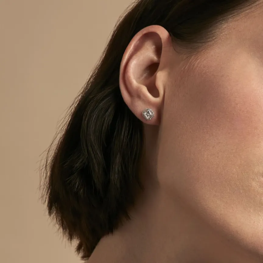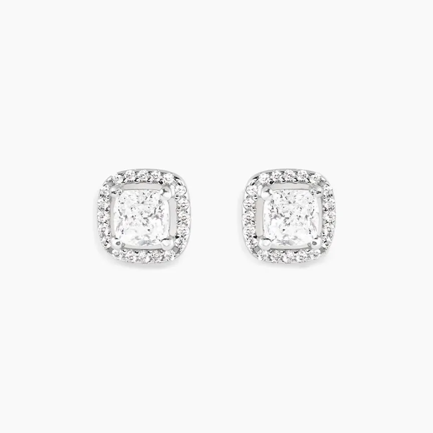Boucles D’ Oreilles Puces Or Blanc 375/1000 Coussin Oxydes De Zirconium Entourage 1.184 Cts Serti Griffes