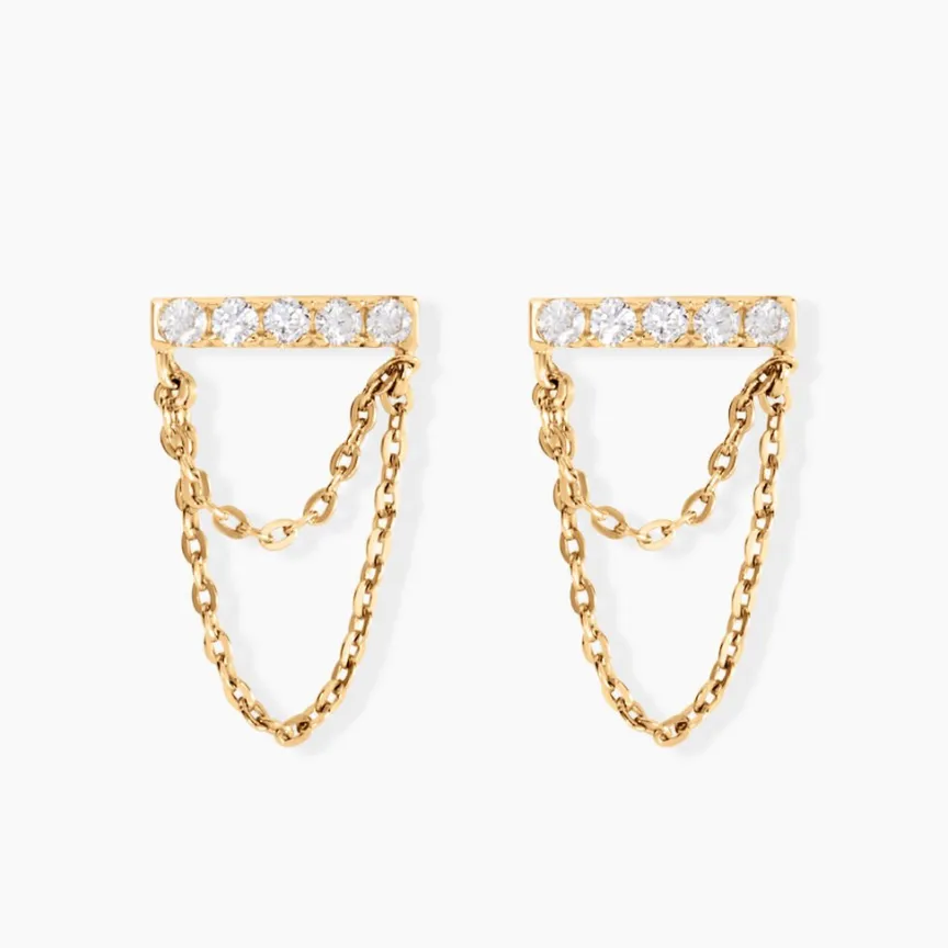 Boucles D’oreilles Puces Or Jaune 375/1000 Barrette Oxydes De Zirconium Sertis Griffes Avec Double Chaines