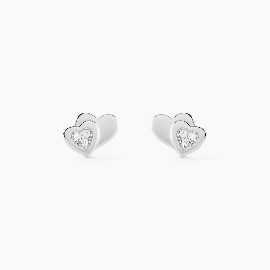 Boucles D’oreilles Puces Argent Blanc 925/1000 Double C艙ur Pavage Oxydes De Zirconium