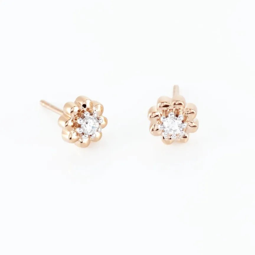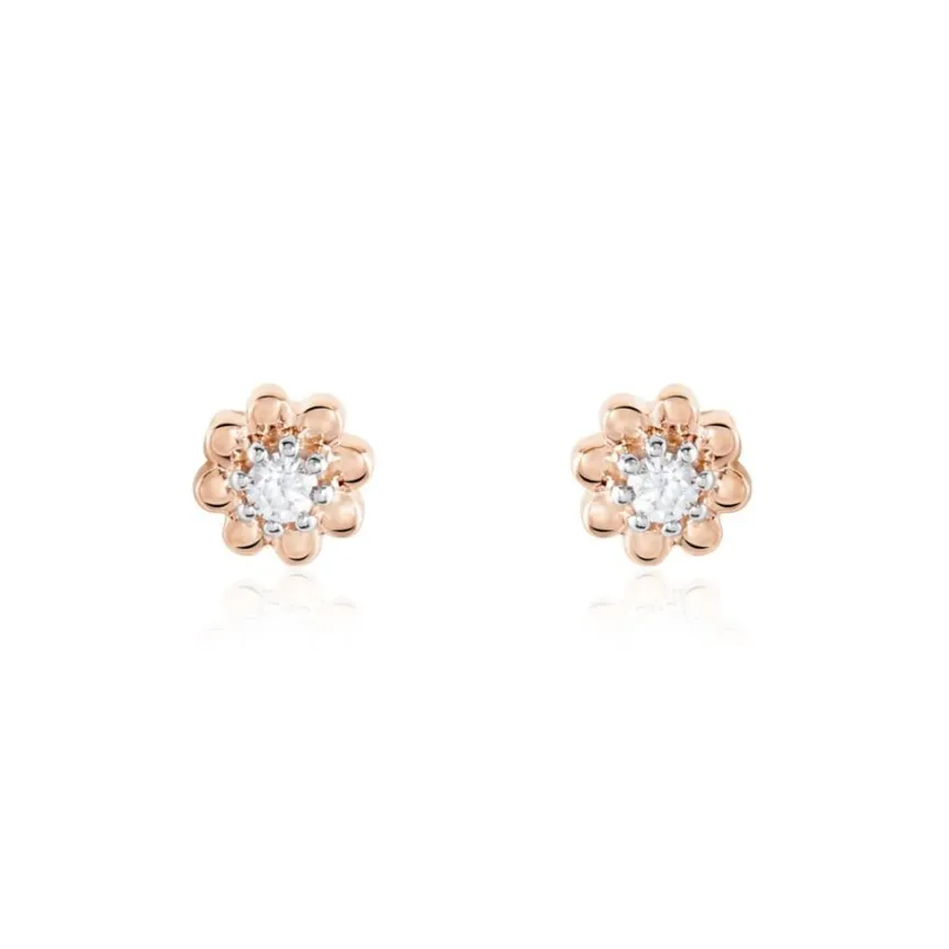 Boucles D’oreilles Puces Argent Rose 925/1000 Fleur Oxyde De Zirconium Serti Griffes