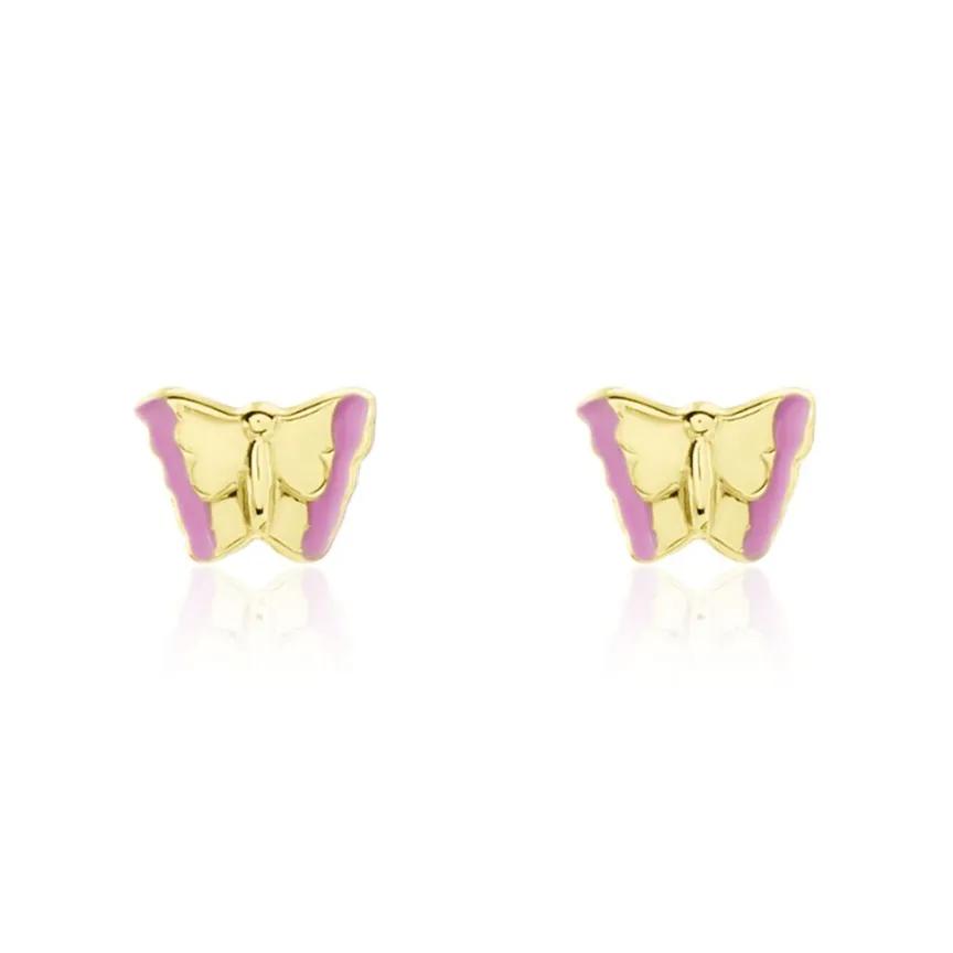 Boucles D’oreilles Or Jaune 375/1000 Puces Papillons Email Rose