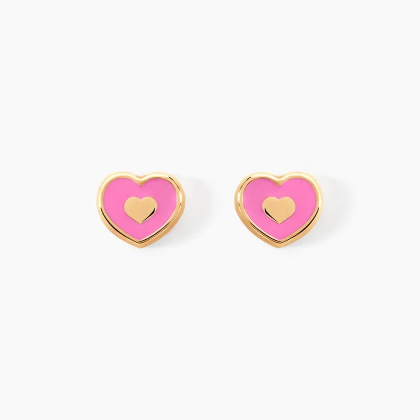 Boucles D’oreilles Puces Or Jaune 375/1000 Coeurs Email Rose