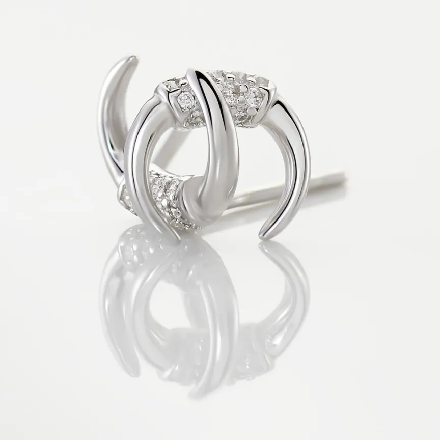 Boucles D’oreilles Puces Argent Blanc 925/1000 Motifs Cornes Pavage Oxydes De Zirconium