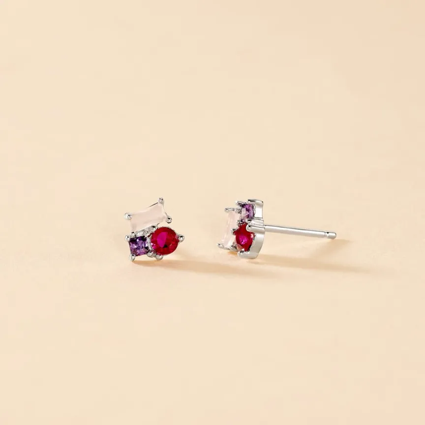 Boucles D’oreilles Puces Multipierres Argent Blanc 925/1000 Spinelles Oxydes De Zirconium Et Verre