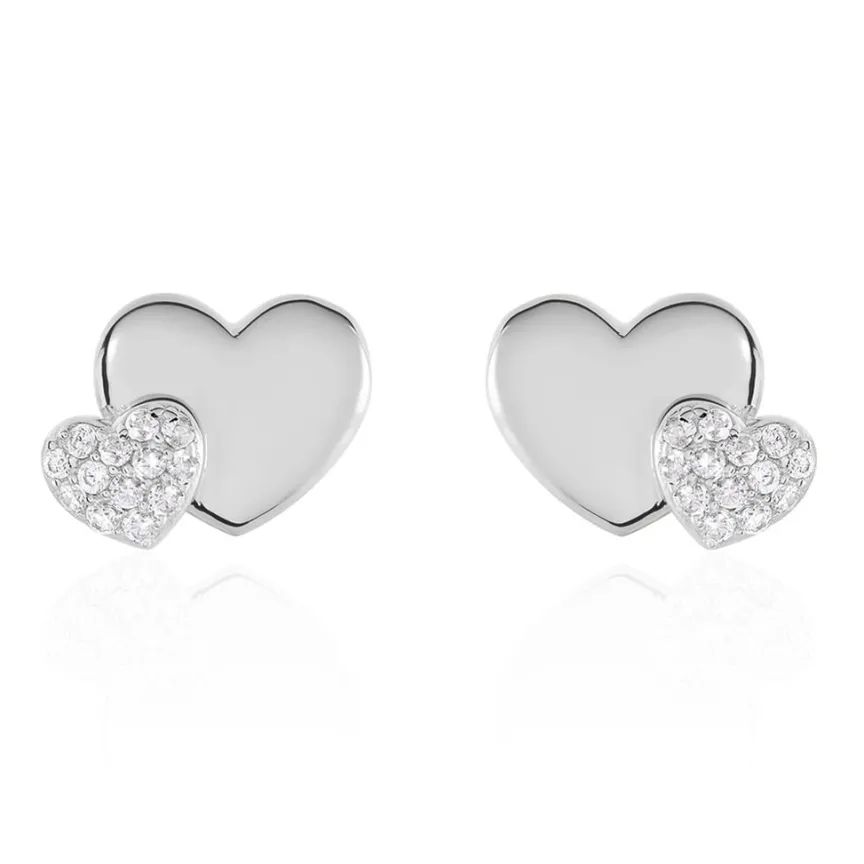 Boucles D’oreilles Puces Argent Blanc 925/1000 Double C艙ur Micro Setting Oxydes De Zirconium