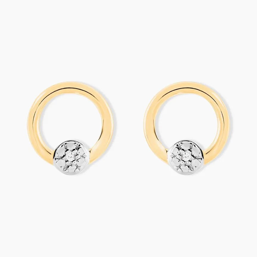 Boucles D’oreilles Or Jaune 375/1000 Puces Cercles Diamants