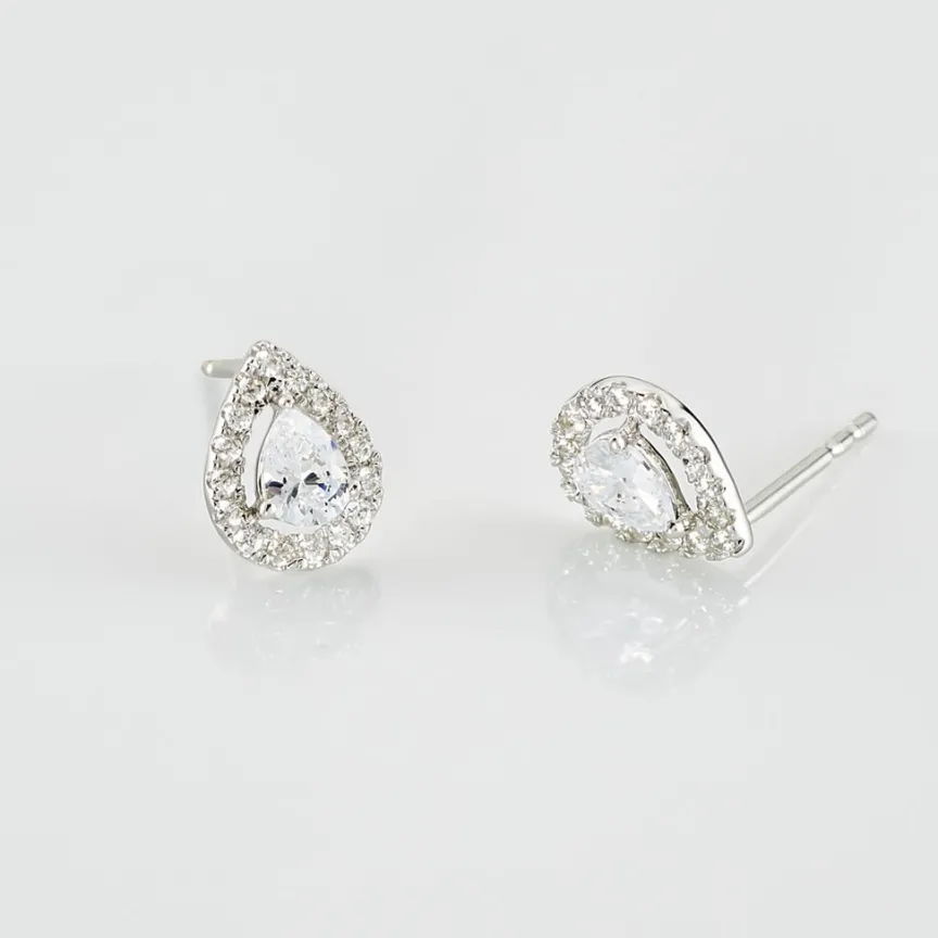 Boucles D’oreilles Or Blanc 375/1000 Puces Oxydes De Zirconium Centraux Formes Poires Entourage Oxydes De Zirconium
