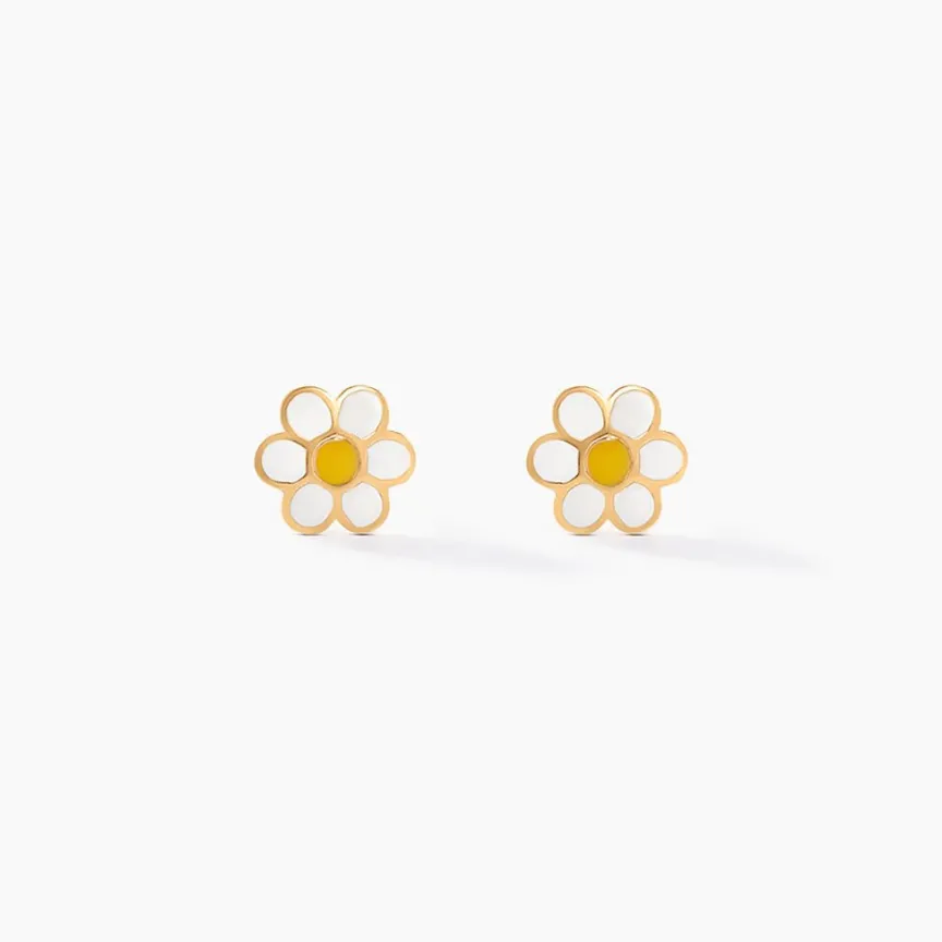 Boucles D’oreilles Puces Or Jaune 750/1000 Fleur Email Blanc Fermoir A Vis