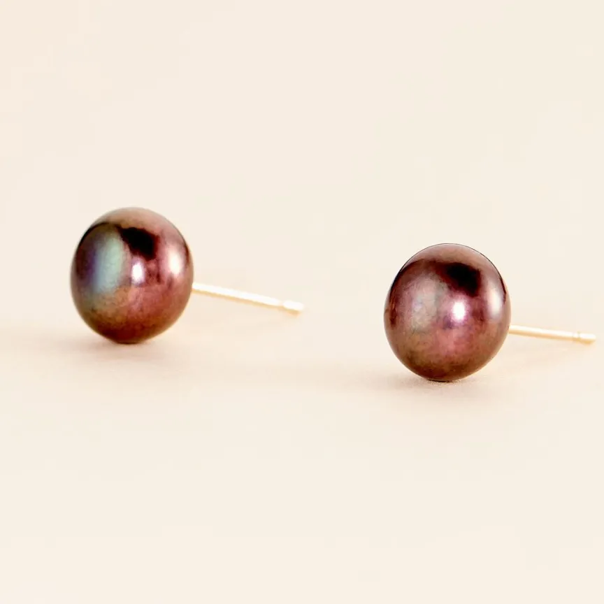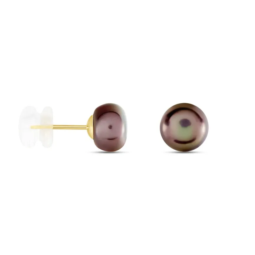 Boucles D’oreilles Or Jaune 375/1000 Perles De Culture Bouton Teintées Noires 7/7.5mm