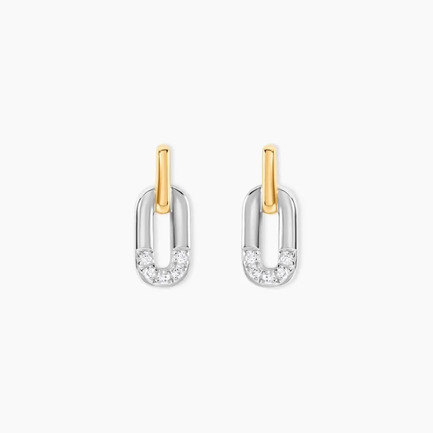 Boucles D’Oreilles Puces Or Jaune 375/1000 Et Argent Blanc 925/1000 Ovale Ajoure Oxydes De Zirconium Blancs