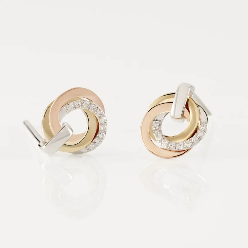 Boucles D’oreilles Puces Or Tricolore 375/1000 Forme Cercles Entrelaces Pavage Diamants
