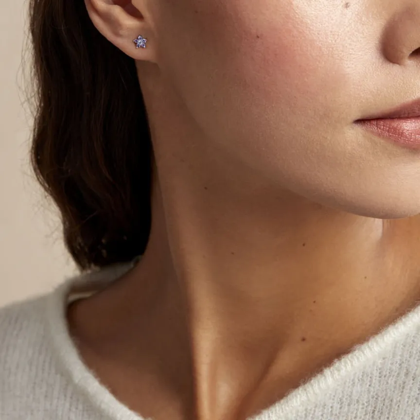 Boucles D’oreilles Puces Argent Blanc 925/1000 Fleurs Depareillees Oxydes De Zirconium Violets Et Roses