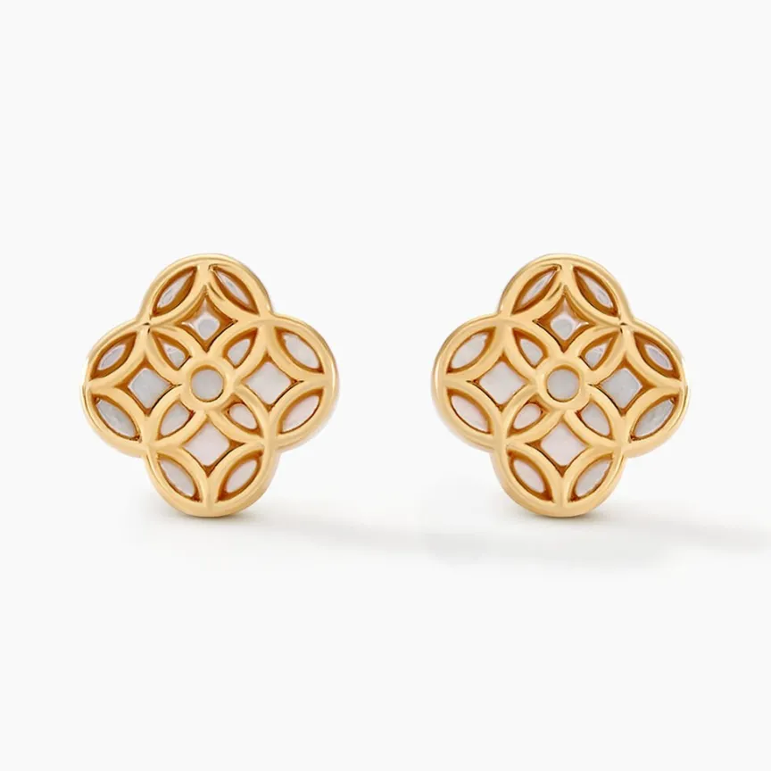 Boucles D’oreilles Puces Or Jaune 375/1000 Fleur Rosace Nacre Blanche