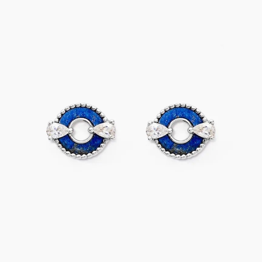 Boucles D’oreilles Puces Argent Blanc 925/1000 Cercle Ajouré Lapis Lazuli Et Oxydes De Zirconium Entourage Perlé