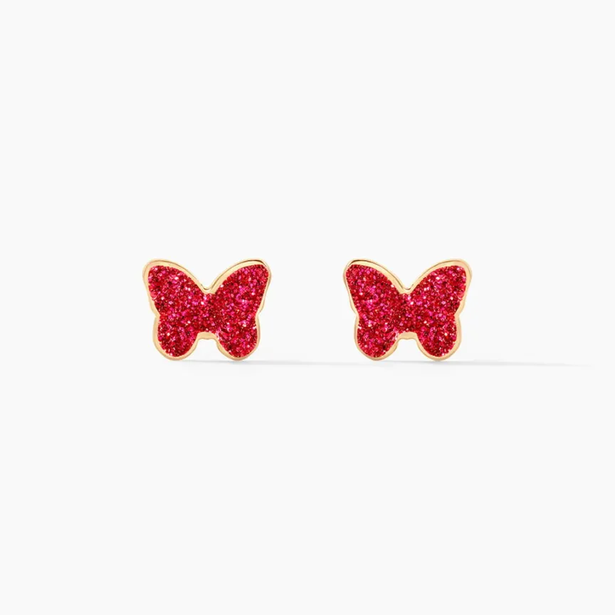 Boucles D’oreilles Or Jaune 375/1000 Puces Papillons Glitter Fushia