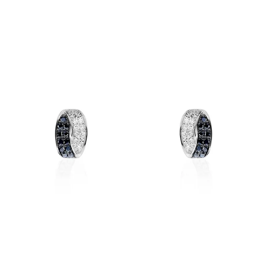 Boucles D’oreilles Or Blanc 375/1000 Diamant Blanc Et Diamant Noir Noeud Plat